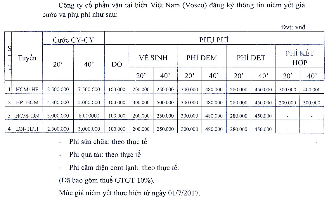 Mức giá niêm yết từ ngày 01/7/2017 03/08/2017 / admin / 10,525 Keywords: Công ty cổ phần vận tải biển Việt Nam Vosco vận tải biển Việt Nam Vận tải Hải Phòng