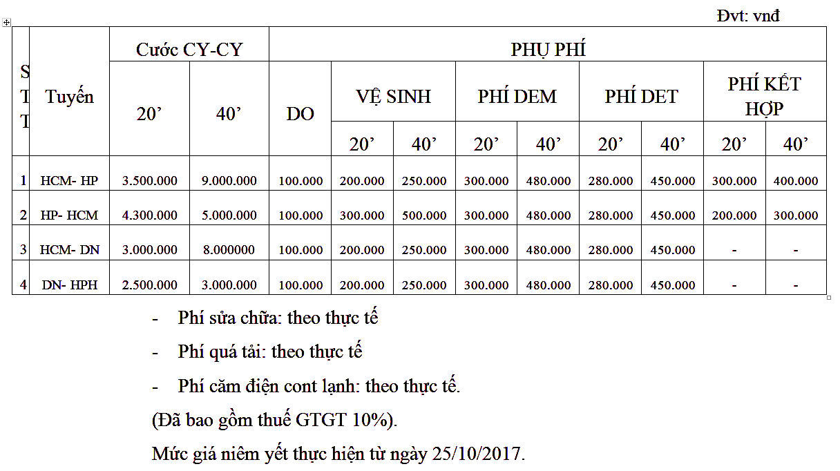 Mức giá niêm yết từ ngày 25/10/2017 17/10/2017 / admin / 3,798 Công ty cổ phần vận tải biển Việt Nam (Vosco) đăng ký thông tin niêm yết giá cước và phụ phí như sau: Keywords: Công ty cổ phần vận tải biển Việt Nam Vosco vận tải biển Việt Nam Vận tải Hải Phòng