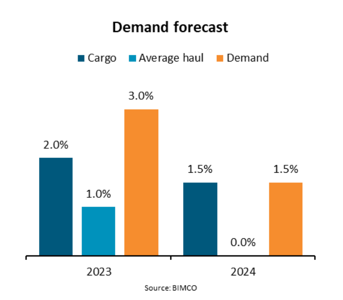 - Dự báo nhu cầu vận chuyển sẽ tăng khoảng 2-3% trong năm 2023 và 1-2% trong năm 2024. Quãng đường vận chuyển dài hơn cũng khiến cho số tấn luân chuyển tăng so với năm 2023.