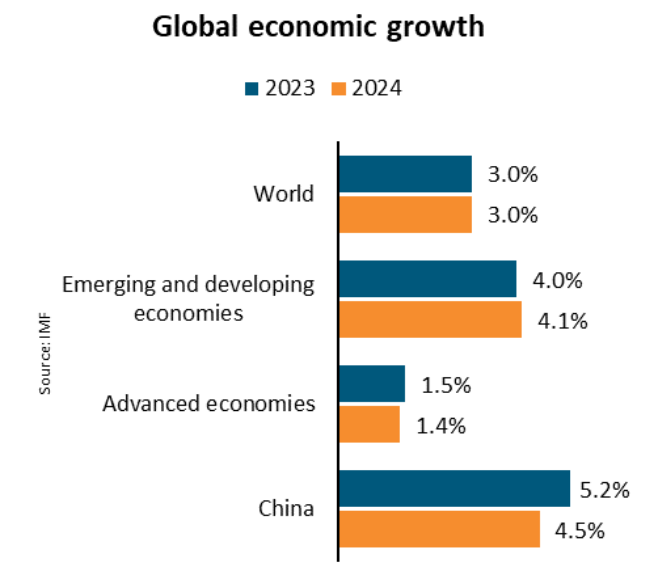 Trong tháng 7, IMF dự báo kinh tế toàn cầu tăng trưởng khoảng 3% trong cả năm 2023 và 2024. Dự báo này cao hơn một chút so với số liệu trước đây của họ, nhưng vẫn thấp hơn mức tăng trưởng bình quân toàn cầu hàng năm là 3,7% kể từ năm 2010. Thách thức chủ đạo đối với các nền kinh tế vẫn là lạm phát, dẫn đến việc các ngân hàng trung ương của nhiều quốc gia phải tăng lãi suất, làm giảm tốc độ tăng trưởng của nền kinh tế.