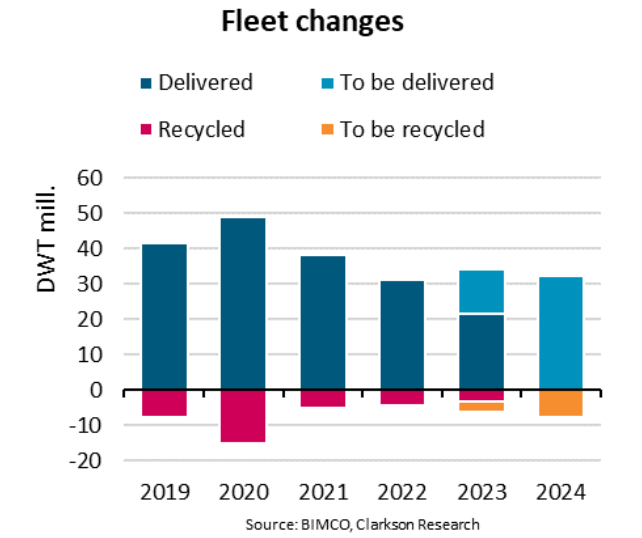 Hơn 3,1 triệu dwt được phá dỡ kể từ đầu năm, tăng 47,5% so với cùng kỳ, tuy nhiên số lượng tàu phá dỡ vẫn chỉ chiếm một phần nhỏ so với đội tàu khô hiện tại. Dự kiến sẽ có khoảng 6,1 triệu dwt được phá dỡ trong cả năm 2023 và 7,5 triệu dwt trong năm 2024. Hầu hết các tàu được phá dỡ vẫn là những tàu đã già và không thể đáp ứng được các quy định về môi trường.
