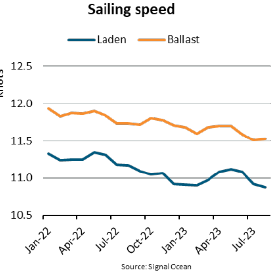 Do tốc độ chạy giảm đi, hiệu suất của đội tàu dự kiến giảm 1-2% trong năm 2023 và 1,5% năm 2024. Kể từ đầu năm, bình quân tốc độ chạy có hàng và chạy ballast của đội tàu hàng khô đã lần lượt giảm 2,5% và 1,8%. Kể từ năm 2022, các tàu đã giảm dần dần tốc độ do giá nhiên liệu cao, mức cước thấp và các quy định về bảo vệ khí hậu, môi trường.