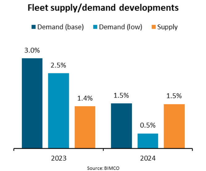 Về tổng thể, Bimco dự báo cân bằng cung cầu sẽ tương đối ổn định cho đến cuối năm 2024. Dự kiến cung tàu tăng 1-2% trong năm 2023 và 2024, trong khi tăng trưởng của cầu vận chuyển là 1,5-2,5% năm 2023 và 1-2% năm 2024. Trong một kịch bản xấu hơn về sự sút giảm nhu cầu vận chuyển, Bimco dự kiến sẽ có sự mất cân bằng nhẹ giữa cung và cầu, đặc biệt trong năm 2024.