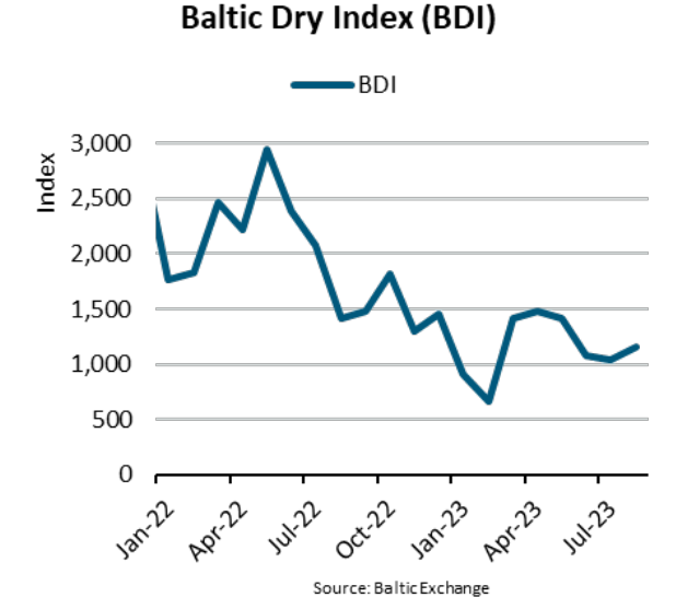 Bình quân giá cước tàu hàng khô đã giảm thấp kể từ nửa cuối năm 2022. Tháng 8/2023, capesize là phân khúc duy nhất có sự tăng trưởng cước so với cùng kỳ. Điều đó có được là do sự gia tăng các lô hàng quặng và bô-xit, cả về số lượng lẫn trung bình độ dài quãng đường vận chuyển trong khi cung tàu chỉ tăng gần 2,2% so với cùng kỳ năm 2022. Còn lại, tại các phân khúc tàu nhỏ hơn, giá cước đều giảm do thiếu hụt các lô hàng ngũ cốc, sự sụt giảm những lô hàng rời cỡ nhỏ trên thị trường mà cung tàu lại tăng 3,5% so với cùng kỳ.