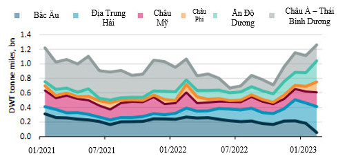 Điểm đến của dầu thô xuất khẩu từ Nga đã được dịch chuyển sang Ấn Độ, Trung Quốc và các quốc gia ở khu vực Địa Trung Hải. Khối lượng luân chuyển dầu thô xuất khẩu từ Nga trong tháng 02/2023 trung bình cao hơn 24% so với tháng 11/2022 (trước khi lệnh trừng phạt của Phương Tây đối với dầu thô Nga có hiệu lực) và tăng hơn gấp đôi so với năm trước (2022). Quá trình dịch chuyển của giao dịch thương mại tàu chở dầu sản phẩm cũng đã bắt đầu, các khách hàng mới của Nga đã xuất hiện tại khu vực Địa Trung Hải, Châu Á và Châu Mỹ. Khối lượng luân chuyển trung bình đối với dầu sản phẩm của Nga trong tháng 02/2023 đã tăng 13% so với tháng trước đó, và tăng 23% so với năm trước.