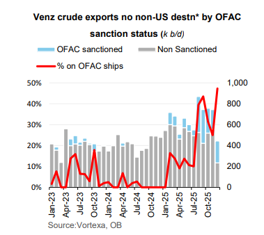 Xuất khẩu dầu thô của Venezuela đến các điểm đến ngoài phạm vi Hoa Kỳ  hiện đang chịu ảnh hưởng lớn bởi đội tàu nằm trong danh sách trừng phạt OFAC, chiếm tỷ trọng áp đảo trong tổng khối lượng vận chuyển bằng tàu dầu.