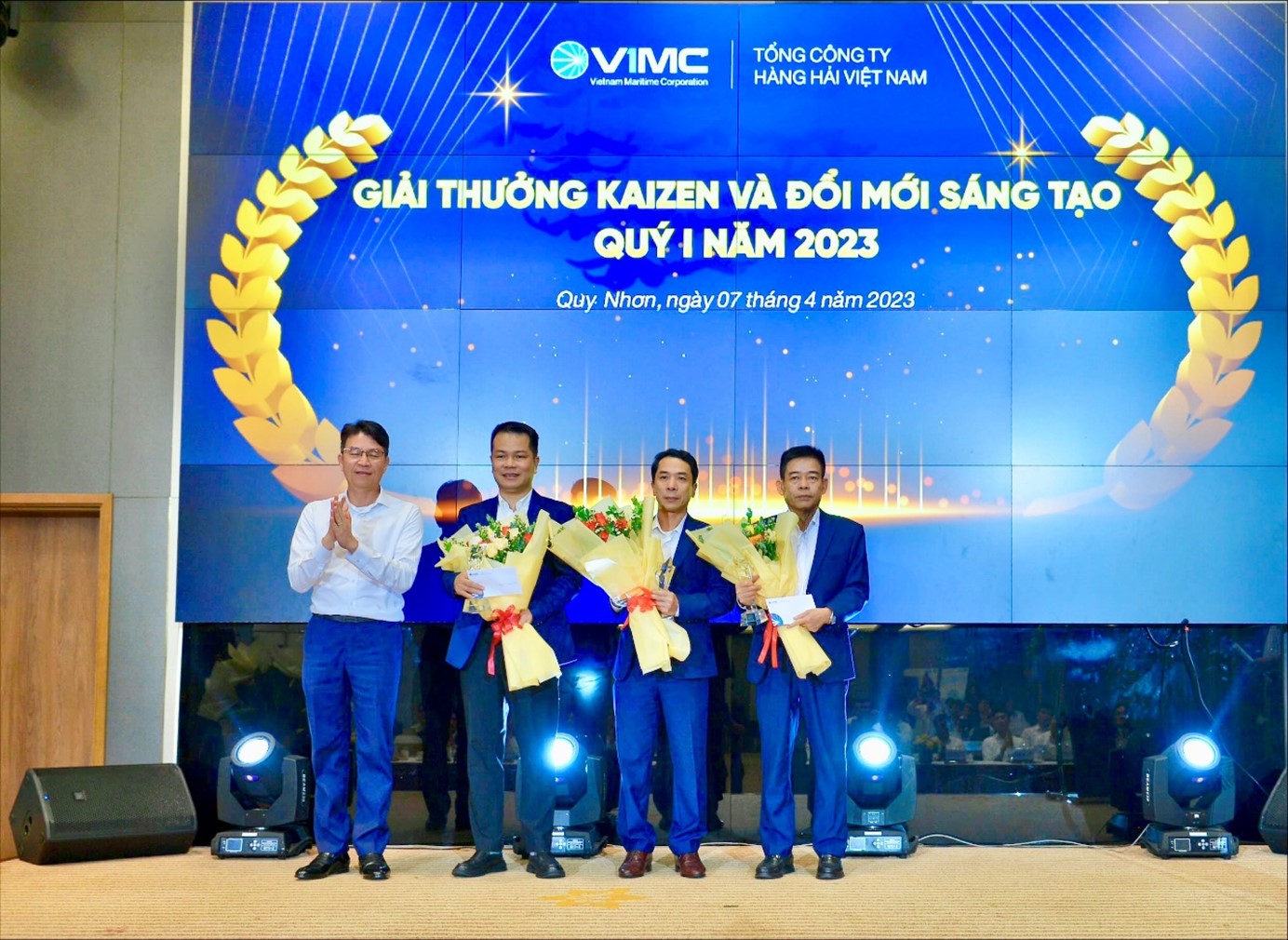 (Ảnh: Ông Cao Minh Tuấn – Tổng giám đốc Vosco(ngoài cùng bên phải) nhận giải thưởng Kim cương về Kaizen và Đổi mới sáng tạo quý 1/2023 do ông Lê Anh Sơn – Chủ tịch HĐQT Tổng Công ty Hàng Hải Việt Nam trao tặng)